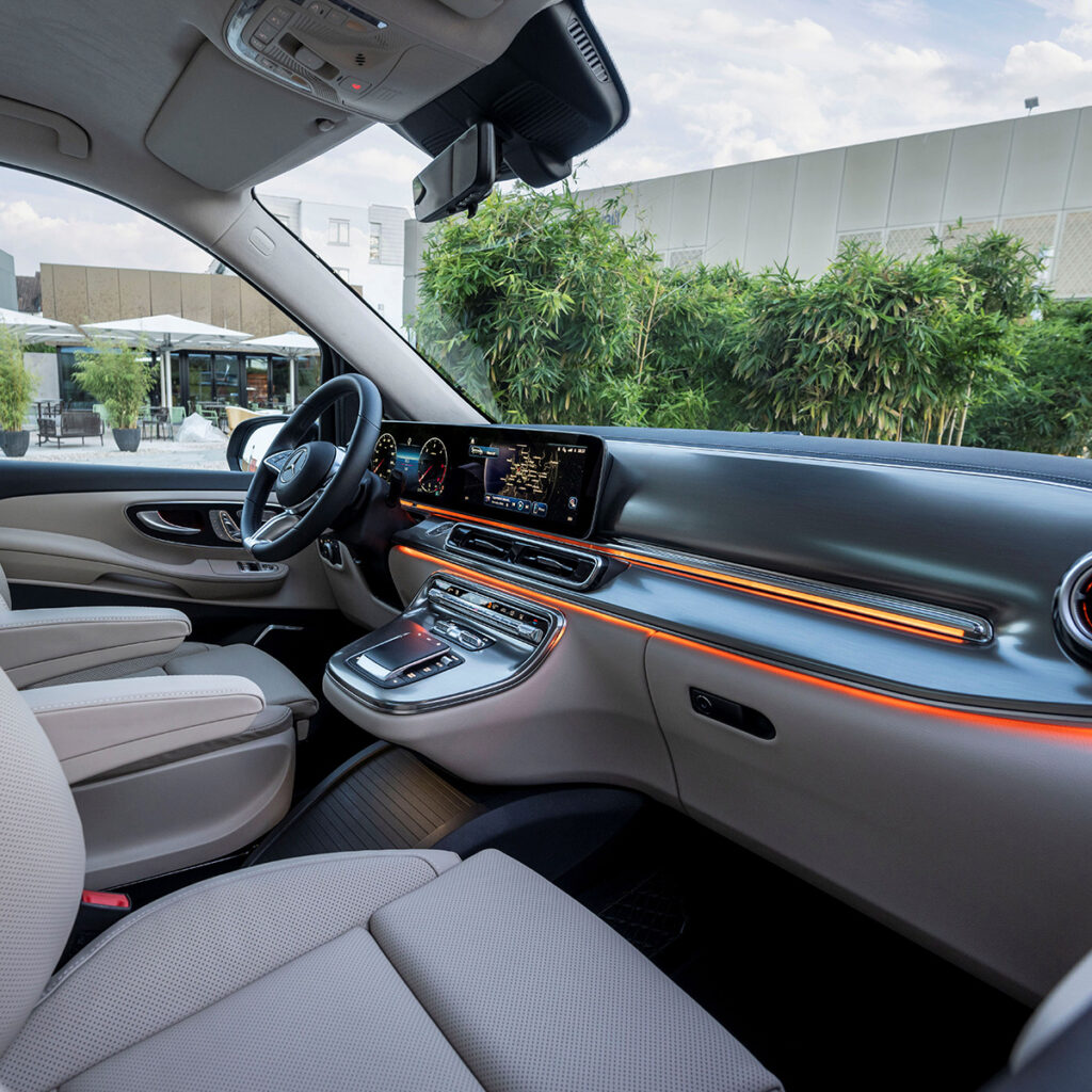 Eine neu gestaltete Instrumententafel mit 12,3 Zoll großem Display in Widescreen-Optik, stilvolle Lüftungsdüsen und eine neue Lenkradgeneration schmücken das Interieur der V-Klasse. Serienmäßig kommt die Großraumlimousine mit der aktuellen Generation des Infotainmentsystems MBUX. Erleben Sie ein einzigartiges digitales und interaktives Erlebnis.